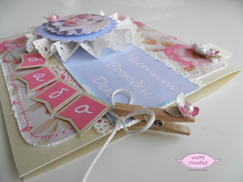 Картичката е страхотна и пликът със нея също. Хартиите,които си използвала са невероятни - нежни, красиви и романтични. Със сигурност няма как да не се хареса на получателката. Харесват ми и всички детайли, които си сложила - красивата розетка, цветенцата, банерчетата, щипката - наистина всичко!